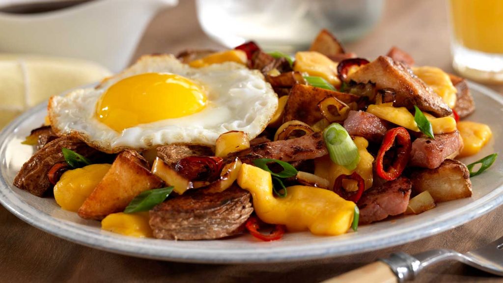 A hearty breakfast skillet including our famous Ellsworth cheese curds, ham, and fried eggs covered in a savory red eye gravy.
