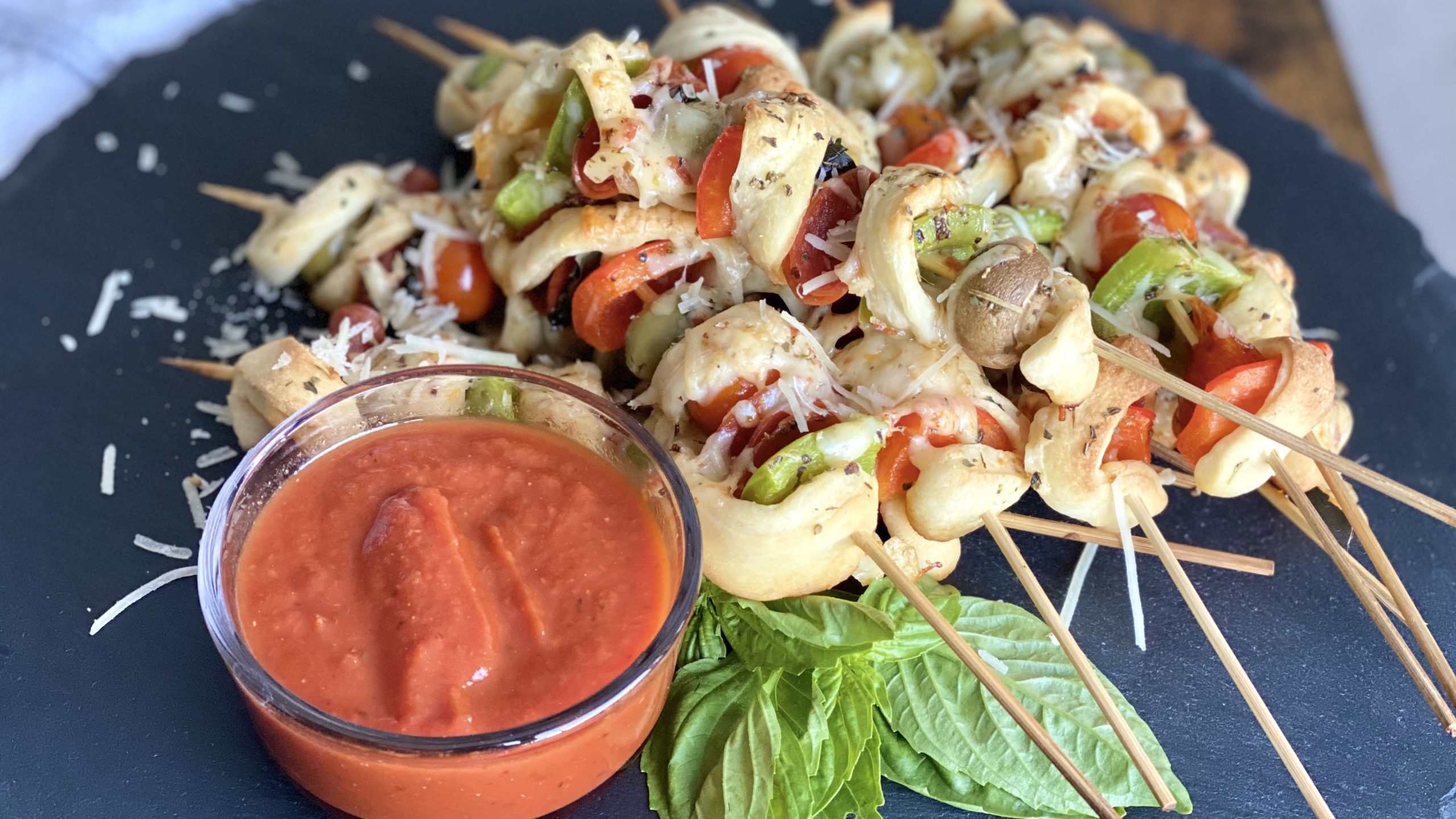 A fun twist on pizza! Making for a party? Place all the toppings in bowls and have guests make their own skewers.